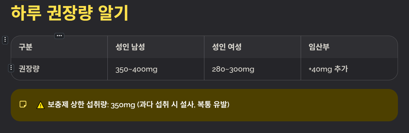 - 참고: 이는 '식사'와 '보충제'를 모두 포함한 수치입니다. 과다 섭취 시 설사나 복통을 유발할 수 있으므로 상한 섭취량인 350mg(보충제 기준)을 넘지 않도록 주의해야 합니다.
