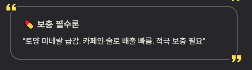 반면, 현대의 토양은 화학 비료 사용으로 인해 과거보다 미네랄 함량이 급감했다는 의견도 많습니다. 또한 커피(카페인)와 술을 즐기는 현대인은 마그네슘 배출이 빠르기 때문에, 적극적인 영양제 섭취가 만성 피로 해결의 열쇠라고 강조합니다.