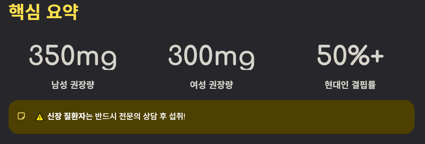 - 권장량: 성인 남성 350mg, 여성 300mg 내외를 기억하세요.