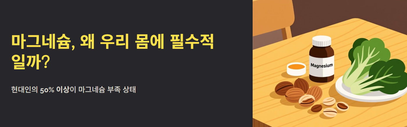 마그네슘은 체내 에너지 생성, 신경 전달, 근육 수축 및 이완에 결정적인 역할을 하는 미네랄입니다. 하지만 안타깝게도 가공식품 위주의 식단과 과도한 스트레스로 인해 현대인의 약 50% 이상이 마그네슘 부족 상태라는 통계가 있습니다.