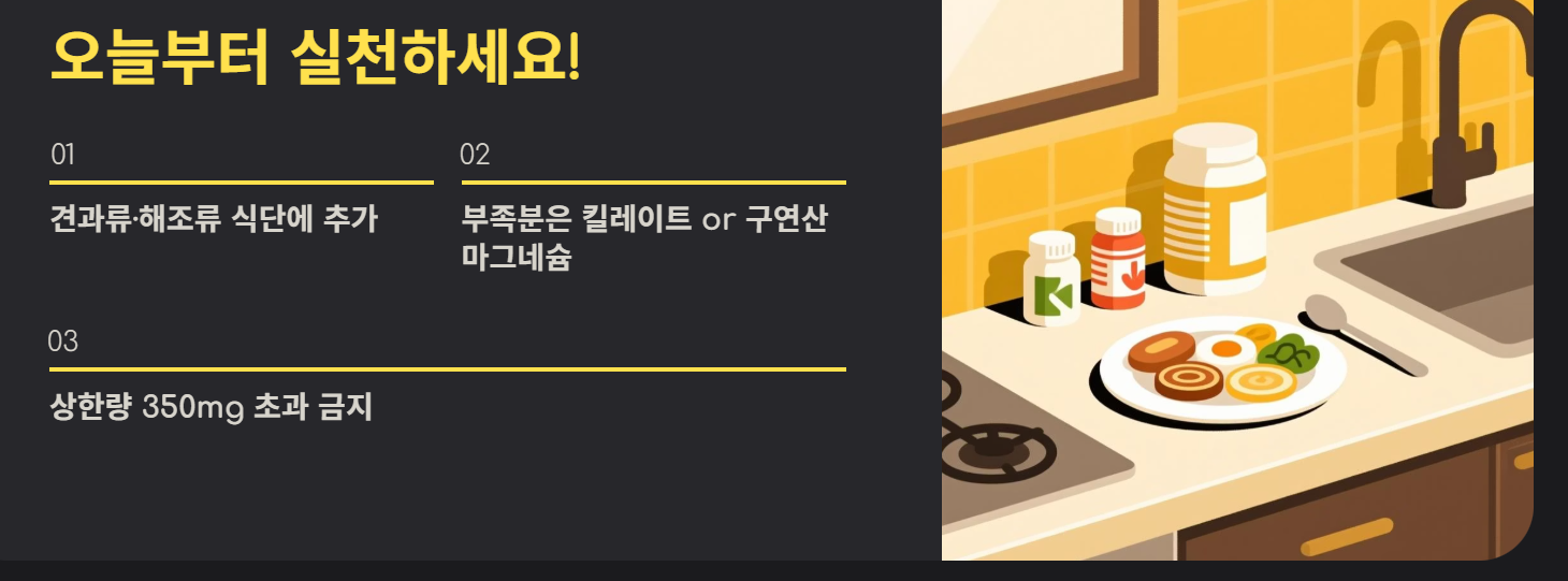 - 방법: 1차적으로는 견과류와 해조류를 섭취하고, 부족분은 킬레이트나 구연산 마그네슘으로 채우세요.